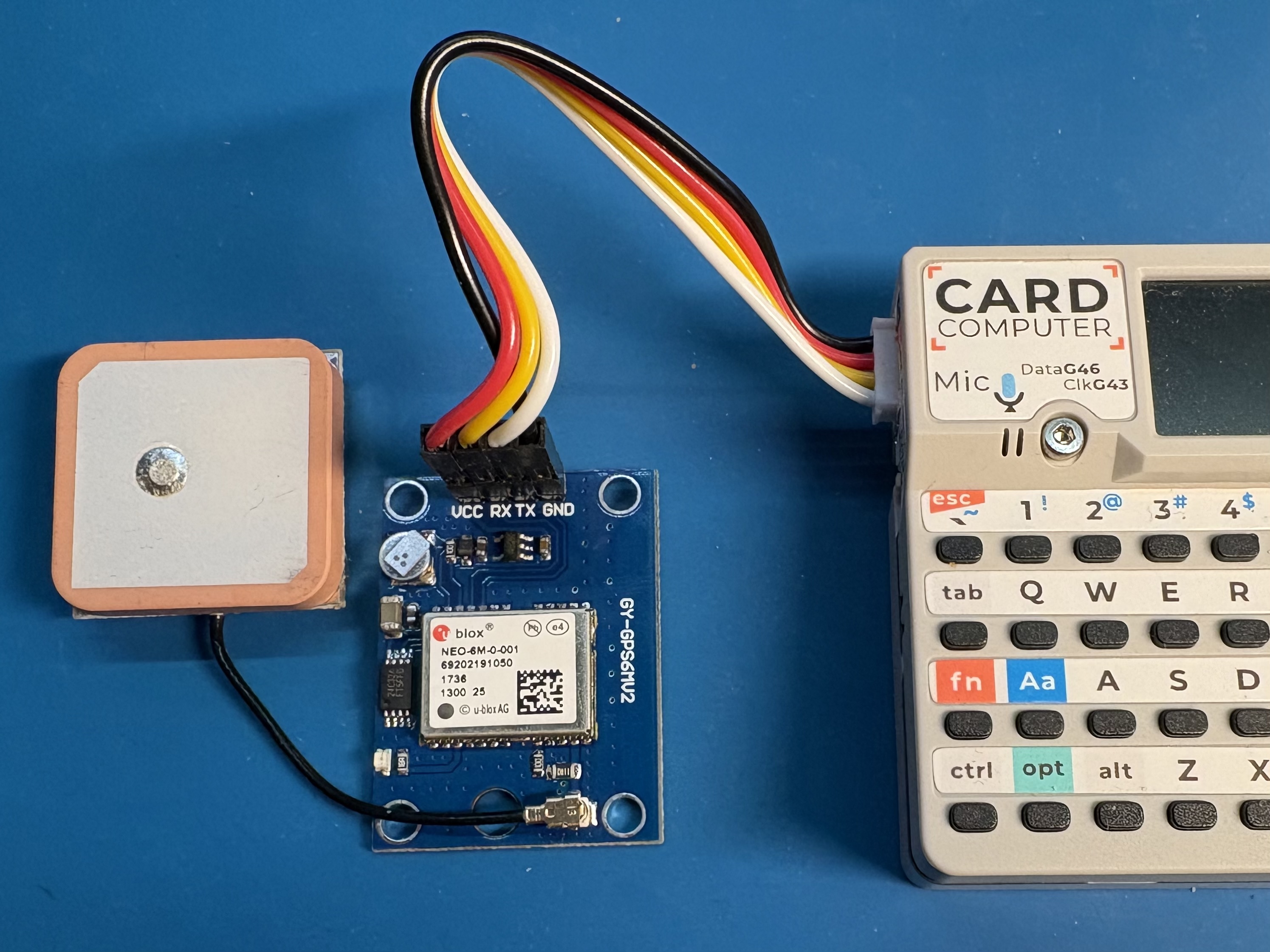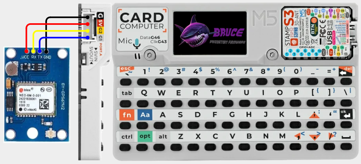 Cardputer - GPS# Configuration# More information GPS modules can be found here. Default Pins: RX=1 TX=2 Items Needed# GPS Module Pins# GPS Cardputer VCC/5V - 1 5V RX - 2 G2 TX - 3 G1 GND - 4 GND Wiring Diagram# View on Cirkit Designer