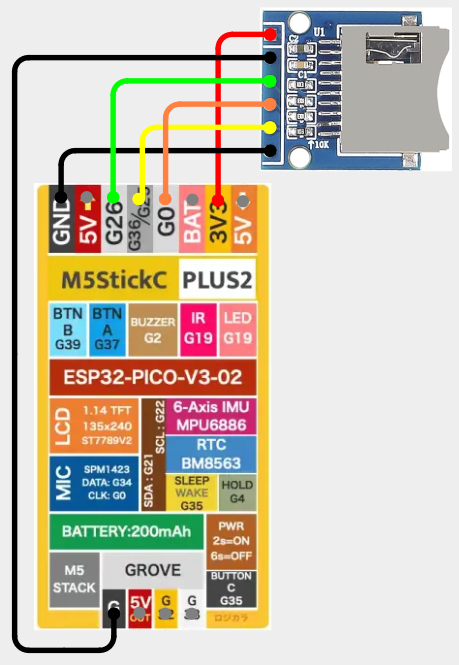 M5StickC - SD Card# Items Needed# SD Card Module Pins# SD Card Module M5StickC 3V3 - 1 3V3 CS - 2 GND MOSI - 3 G26 CLK - 4 G0 MISO - 5 G36/G25 GND - 6 GND Wiring Diagram# View on Cirkit Designer